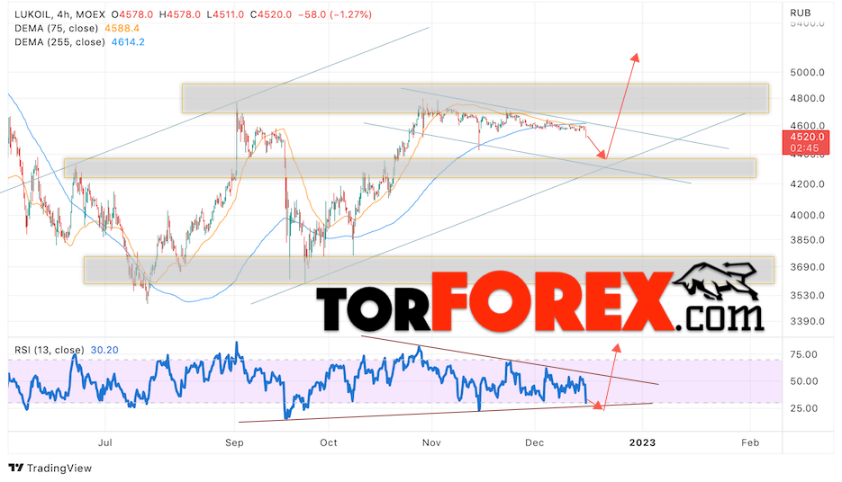 В пользу подъёма стоимости и котировок LKOH выступит тест линии поддержки на индикаторе относительной силы. Вторым сигналом станет отскок от нижней границы бычьего канала. Отменой варианта роста акций Лукойл станет падение и пробой уровня 4205. Это укажет на пробой нижней границы канала и продолжение снижения котировок LKOH в область ниже уровня 3825. Подтверждением подъёма цен и курса акции выступит пробой области сопротивления и закрытие выше уровня 4765, что укажет на пробой верхней границы нисходящего канала коррекции.