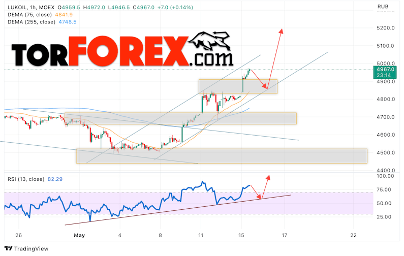 В пользу подъёма стоимости и котировок LKOH выступит тест линии поддержки на индикаторе относительной силы (RSI). Вторым сигналом станет отскок от нижней границы бычьего канала. Отменой варианта роста акций Лукойл станет падение и пробой уровня 4715. Это укажет на пробой нижней границы бычьего канала и продолжение падения котировок LKOH в область ниже уровня 4485. Подтверждением подъёма цен и курса акции выступит пробой области сопротивления и закрытие выше уровня 4985.
