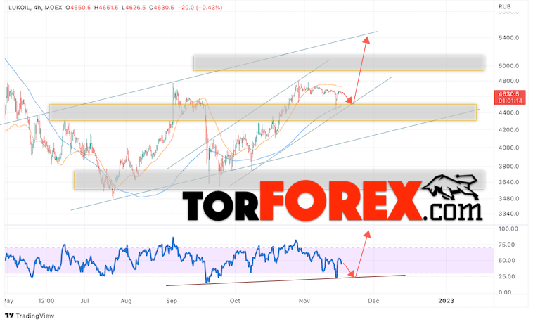 В пользу подъёма стоимости и котировок LKOH выступит тест линии поддержки на индикаторе относительной силы. Вторым сигналом станет отскок от нижней границы бычьего канала. Отменой варианта роста акций Лукойл станет падение и пробой уровня 4215. Это укажет на пробой нижней границы канала и продолжение снижения котировок LKOH в область ниже уровня 3705. Подтверждением подъёма цен и курса акции выступит пробой области сопротивления и закрытие выше уровня 4845.