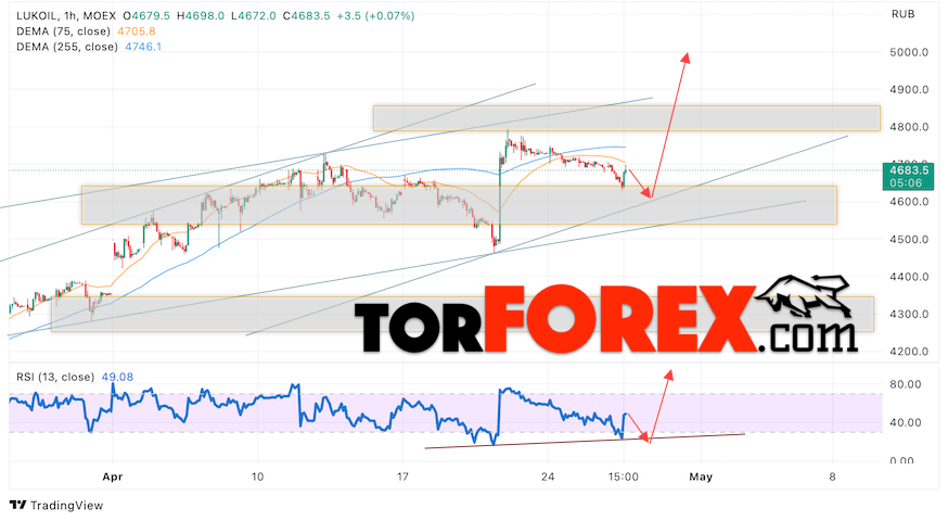 В пользу подъёма стоимости и котировок LKOH выступит тест линии поддержки на индикаторе относительной силы (RSI). Вторым сигналом станет отскок от нижней границы бычьего канала. Отменой варианта роста акций Лукойл станет падение и пробой уровня 4395. Это укажет на пробой верхней границы канала и продолжение падения котировок LKOH в область ниже уровня 3905. Подтверждением подъёма цен и курса акции выступит пробой области сопротивления и закрытие выше уровня 5005.