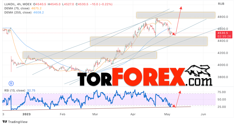 В пользу подъёма стоимости и котировок LKOH выступит тест линии поддержки на индикаторе относительной силы (RSI). Вторым сигналом станет отскок от нижней границы бычьего канала. Отменой варианта роста акций Лукойл станет падение и пробой уровня 4265. Это укажет на пробой нижней границы бычьего канала и продолжение падения котировок LKOH в область ниже уровня 3745. Подтверждением подъёма цен и курса акции выступит пробой области сопротивления и закрытие выше уровня 4845.