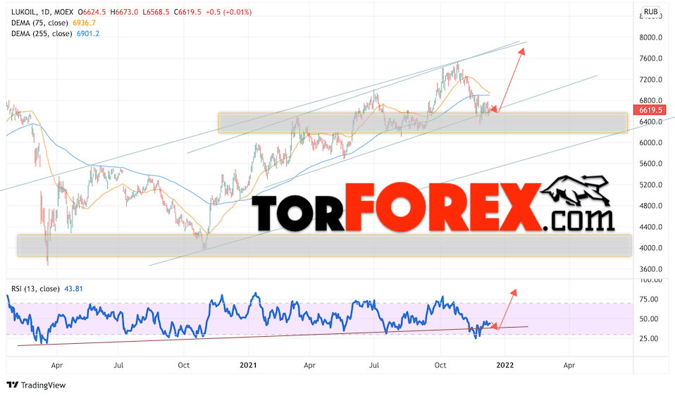 Таким образом, Лукойл прогноз на 13 — 17 декабря 2021 предполагает попытку теста уровня поддержки вблизи области 6425. Откуда стоит ожидать отскок и продолжения роста курса акций Лукойл с целью выше уровня 7645. Дополнительным сигналом в пользу подъёма выступит тест линии поддержки на индикаторе относительной силы. Отменой варианта роста станет пробой области поддержки и закрытие котировок ниже уровня 5995.