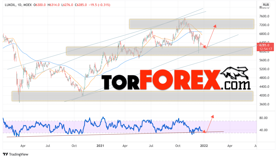 В пользу подъёма стоимости и котировок LKOH выступит тест бычьей линии тренда на индикаторе относительной силы. Вторым сигналом станет отскок от нижней границы восходящего канала. Отменой варианта роста акций Лукойл станет падение и пробой уровня 5905. Это укажет на пробой нижней границы канала и продолжение снижения котировок LKOH в область ниже уровня 4855. Подтверждением подъёма цен и курса акции выступит пробой области сопротивления и закрытие выше уровня 6605.