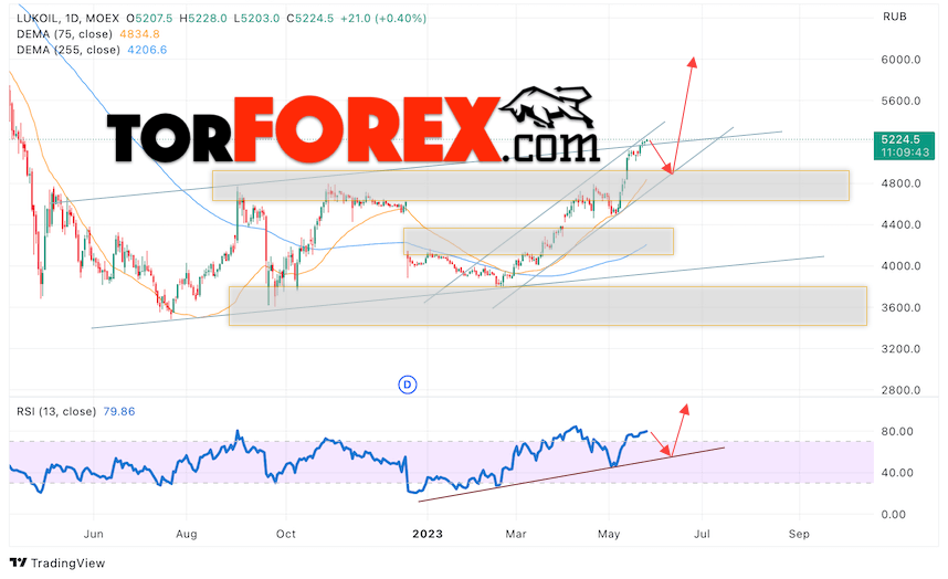 В пользу подъёма стоимости и котировок LKOH выступит тест бычьей линии тренда на индикаторе относительной силы. Вторым сигналом станет отскок от нижней границы восходящего канала. Отменой варианта роста акций Лукойл станет падение и пробой уровня 4605. Это укажет на пробой нижней границы канала и продолжение снижения котировок LKOH в область ниже уровня 3745. Подтверждением подъёма цен и курса акции выступит пробой области сопротивления и закрытие выше уровня 5295, что укажет на пробой верхней границы бычьего канала, а это сигнал к росту на ширину канала.
