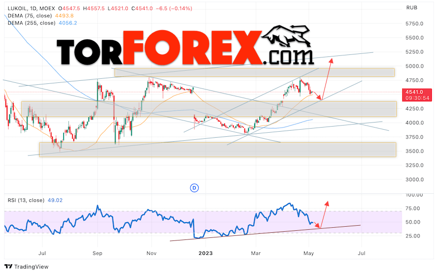 В пользу подъёма стоимости и котировок LKOH выступит тест бычьей линии тренда на индикаторе относительной силы. Вторым сигналом станет отскок от нижней границы восходящего канала. Отменой варианта роста акций Лукойл станет падение и пробой уровня 4235. Это укажет на пробой нижней границы канала и продолжение снижения котировок LKOH в область ниже уровня 3475. Подтверждением подъёма цен и курса акции выступит пробой области сопротивления и закрытие выше уровня 5075, что укажет на пробой верхней границы бычьего канала, а это сигнал к росту на ширину канала.