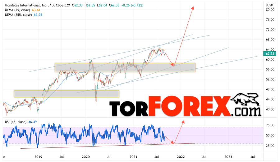 Мы также учитываем технический, фундаментальный анализ акций, новостной фон, общая геополитическая ситуация в мире и другие, более мелкие факторы. В прогнозах акций указаны целевые уровни для акций компании MDLZ, причем как подъёма так и вероятного падения.