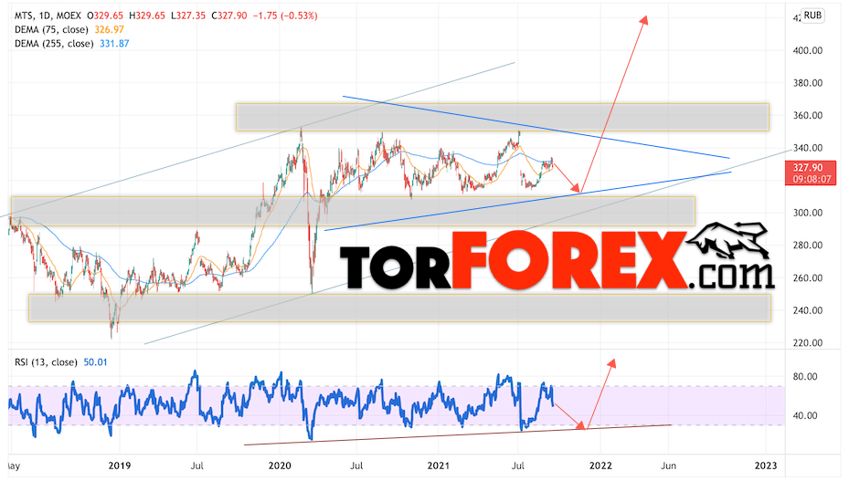 Дополнительным сигналом в пользу подъёма котировок МТС выступит тест линии поддержки на индикаторе относительной силы (RSI). Вторым сигналом станет отскок от нижней границы модели ”Треугольник”. Отменой варианта роста котировок стоимости акций компании МТС станет падение и пробой уровня 285.05. Это укажет на пробой области поддержки и продолжение падения в область на уровне 235.05. Ожидать ускорения подъёма акций стоит с пробоем области сопротивления и закрытием выше уровня 360.05, что укажет на пробой верхней границы модели ”Треугольник”.