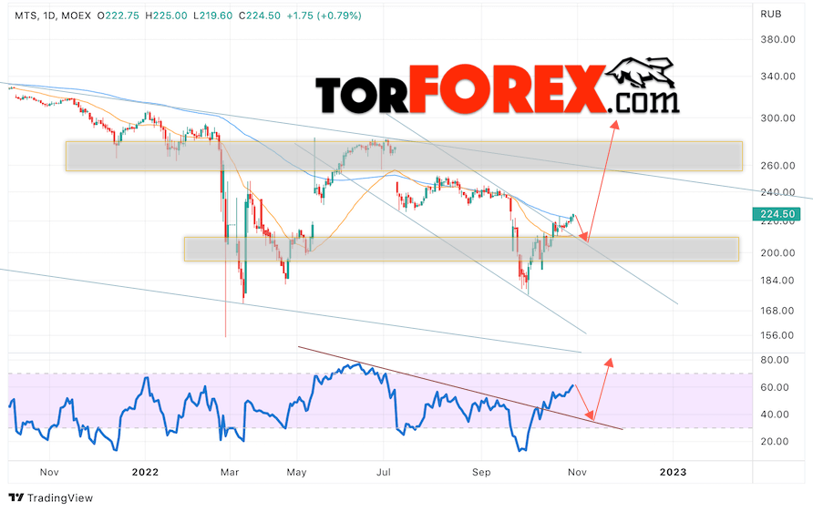В пользу подъёма котировок MTSS выступит тест пробитой линии тренда на индикаторе относительной силы. Вторым сигналом выступит отскок от верхней границы нисходящего канала. Отменой варианта подъёма стоимости акций МТС на следующей торговой неделе станет падение и пробой уровня 190. Это укажет на пробой нижней границы канала и продолжение снижения в область ниже уровня 155. Ожидать подтверждения роста котировок MTSS стоит с пробоем области сопротивления и закрытием выше уровня 255, что укажет на пробой верхней границы очередного нисходящего канала коррекции.