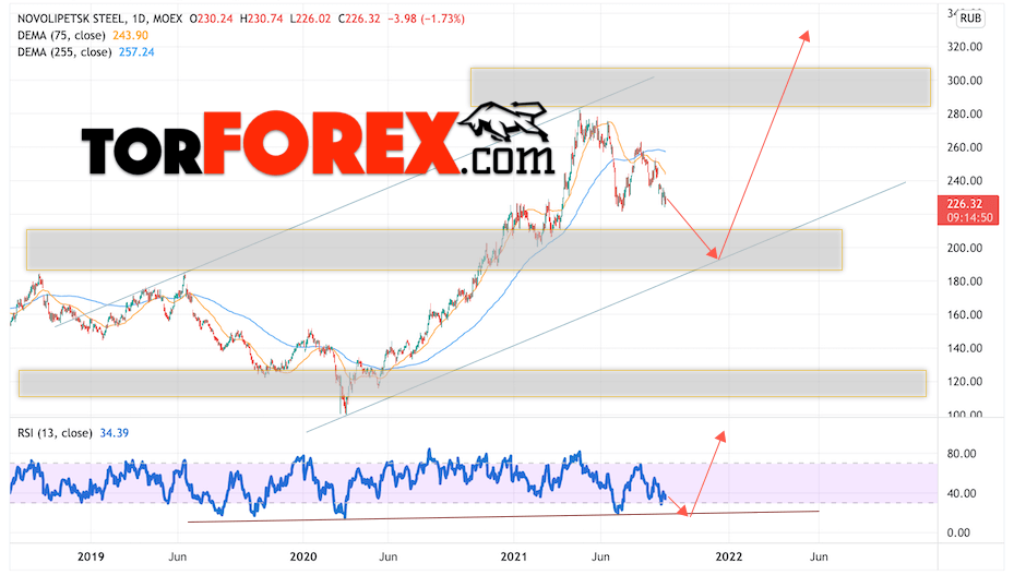 Дополнительным сигналом в пользу подъёма котировок НЛМК выступит тест линии поддержки на индикаторе относительной силы (RSI). Вторым сигналом станет отскок от нижней границы бычьего канала. Отменой варианта роста котировок стоимости акций компании Новолипецкий металлургический комбинат станет падение и пробой уровня 90.55. Это укажет на пробой области поддержки и продолжение падения в область на уровне 60.55. Ожидать ускорения подъёма акций стоит с пробоем области сопротивления и закрытием выше уровня 185.05.
