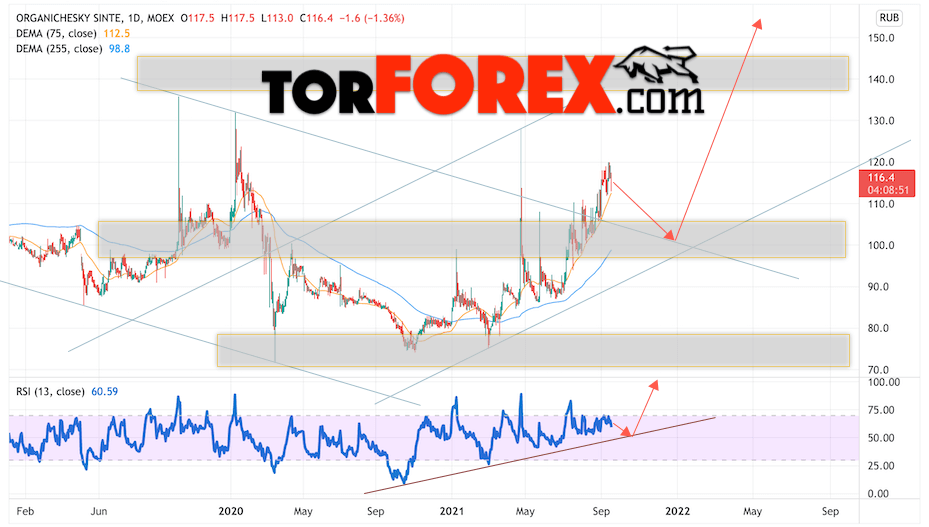 Дополнительным сигналом в пользу подъёма котировок Органический синтез выступит тест линии поддержки на индикаторе относительной силы (RSI). Вторым сигналом станет отскок от нижней границы бычьего канала. Отменой варианта роста котировок стоимости акций компании Органический синтез станет падение и пробой уровня 90.05. Это укажет на пробой области поддержки и продолжение падения в область на уровне 75.55. Ожидать ускорения подъёма акций стоит с пробоем области сопротивления и закрытием выше уровня 125.55.