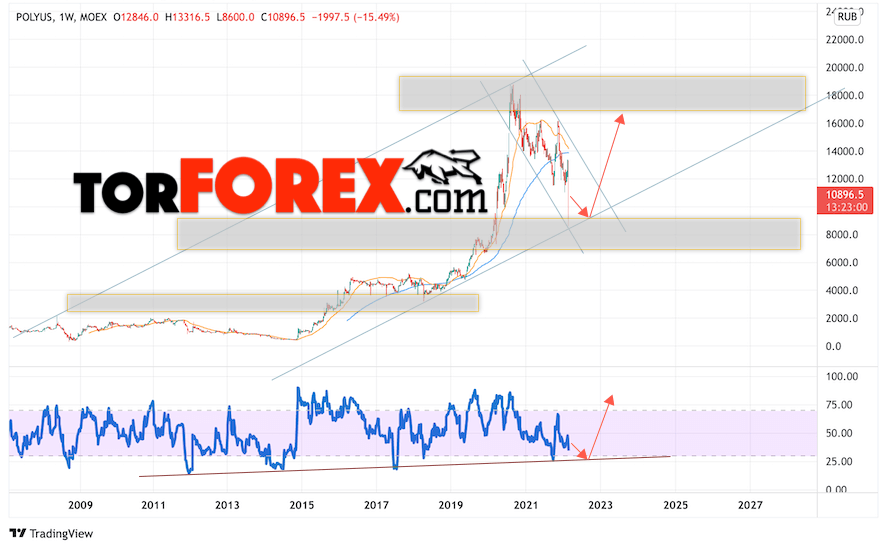 Таким образом, Полюс Золото прогноз на 28 февраля — 4 марта 2022 предполагает попытку теста области поддержки вблизи уровня 9005. Далее, продолжение роста котировок PLZL с целью выше уровня 16205. Отменой варианта подъёма цены акций Полюс Золото выступит падение и пробой уровня 7600. Это укажет на пробой нижней границы бычьего канала. В этом случае стоит ожидать продолжения падения ниже уровня 2005.