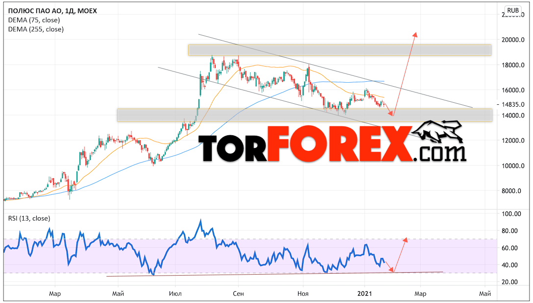 Котировки акций Полюс Золото завершают торговую неделю вблизи области 14835.0. Актив продолжает движение в рамках коррекции и нисходящего канала. Скользящие средние указывают на наличие медвежьей тенденции. Цены оттолкнулись от области между сигнальными линиями, что указывает на давление со стороны продавцов актива. В рамках прогноза курса и стоимости Полюс Золото на текущей торговой неделе 25 — 29 января 2021 стоит ожидать попытку падения и тест уровня поддержки вблизи области 14065.0. Откуда стоит ожидать отскок и продолжения роста курса акций Полюс Золото с целью выше уровня 20105.0.