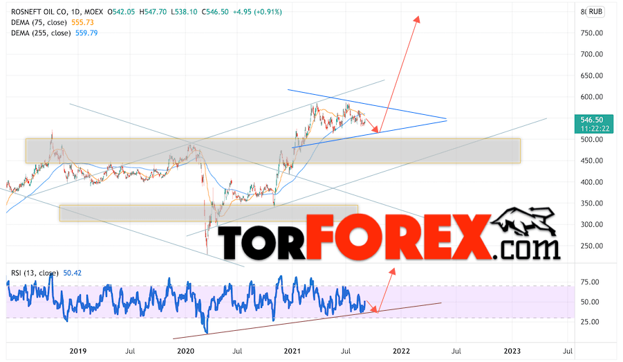 Дополнительным сигналом в пользу роста котировок Роснефть выступит тест линии поддержки на индикаторе относительной силы (RSI). Вторым сигналом станет отскок от нижней границы модели ”Треугольник”. Отменой варианта подъёма котировок стоимости акций компании ROSN станет падение и пробой уровня 465.05. Это укажет на пробой нижней границы модели, в этом случае можно рассматривать продолжение снижения бумаг в область на уровне 305.05. Ожидать подтверждения подъёма акций стоит с пробоем области сопротивления и закрытием выше уровня 605.05, что укажет на выход цен за пределы модели ”Треугольник”.