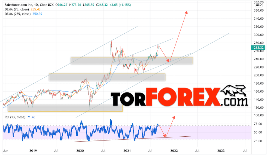 Дополнительным сигналом в пользу роста котировок Salesforce выступит тест линии тренда на индикаторе относительной силы (RSI). Вторым сигналом станет отскок от нижней границы бычьего канала. Отменой варианта подъёма котировок стоимости акций компании Salesforce станет падение и пробой уровня 215.05. Это укажет на пробой области поддержки, в этом случае можно рассматривать продолжение снижения бумаг в область на уровне 135.55. Ожидать подтверждения подъёма акций стоит с пробоем области сопротивления и закрытием выше уровня 295.05.