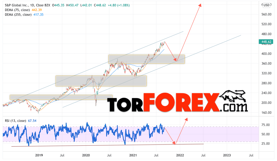 Дополнительным сигналом в пользу роста котировок S&P Global выступит тест линии поддержки на индикаторе относительной силы (RSI). Вторым сигналом станет отскок от нижней границы бычьего канала. Отменой варианта подъёма котировок стоимости акций компании SPGI станет падение и пробой уровня 320.05. Это укажет на пробой нижней границы канала, в этом случае можно рассматривать продолжение снижения бумаг в область на уровне 210.55. Ожидать подтверждения подъёма акций стоит с пробоем области сопротивления и закрытием выше уровня 465.05.