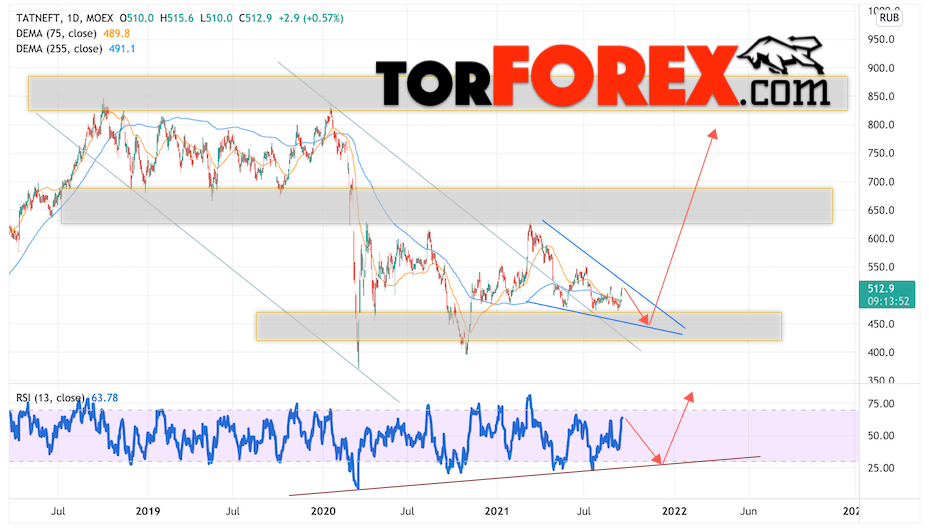 Дополнительным сигналом в пользу подъёма котировок Татнефть выступит тест линии поддержки на индикаторе относительной силы (RSI). Вторым сигналом станет отскок от нижней границы разворотной модели ”Клин”. Отменой варианта роста котировок стоимости акций компании Татнефть станет падение и пробой уровня 395.05. Это укажет на пробой области поддержки и продолжение падения в область на уровне 295.05. Ожидать ускорения подъёма акций стоит с пробоем области сопротивления и закрытием выше уровня 545.5, что укажет на пробой верхней границы модели ”Клин”.