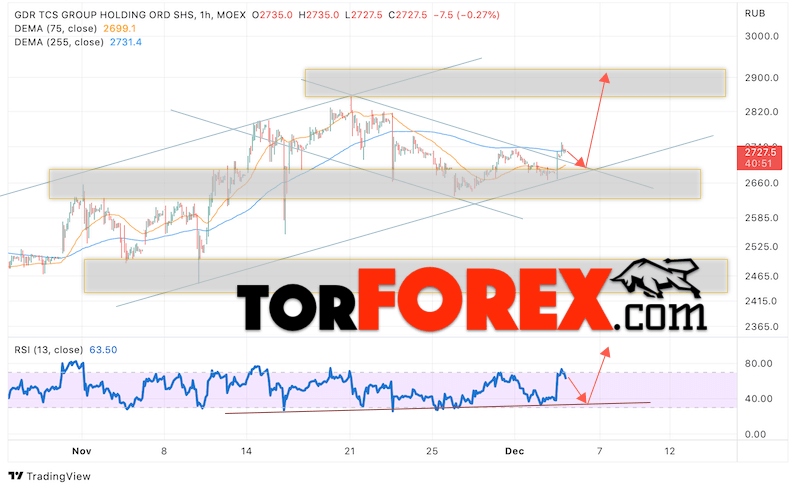 Котировки акций TCSG завершают торговую неделю вблизи области 2727. Бумага продолжает движение в рамках роста и бычьей канала. Скользящие средние указывают на наличие бычьей тенденции по акциям компании. Цены вновь тестируют область между сигнальными линиями, что указывает на давление со стороны продавцов актива и потенциальное продолжение развития нисходящей тенденции. В рамках прогноза курса и стоимости Тинькофф Банк на 6 декабря 2022 стоит ожидать попытку коррекции и тест уровня поддержки вблизи области 2645. Откуда стоит рассматривать отскок вверх и продолжение подъёма курса акций с целью выше уровня 2905.