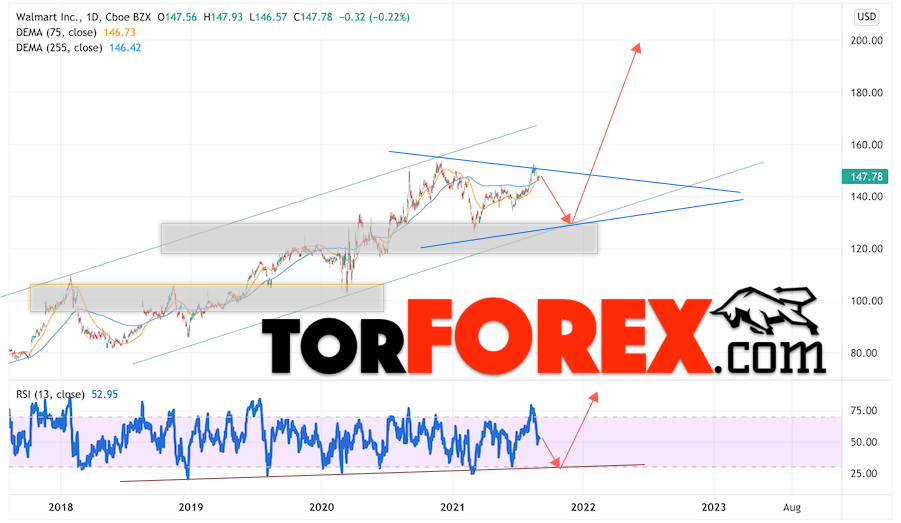 Стоит ли покупать или продавать акции Walmart сегодня? До каких уровней могут расти акции этой компании через год, два, три? Сколько будут стоить бумаги Walmart в 2021, 2022, 2023 годах? Мы давно составляет прогнозы курсов валют, а также можем предсказать поведение фондового рынка с помощью технического анализа и простых индикаторов.