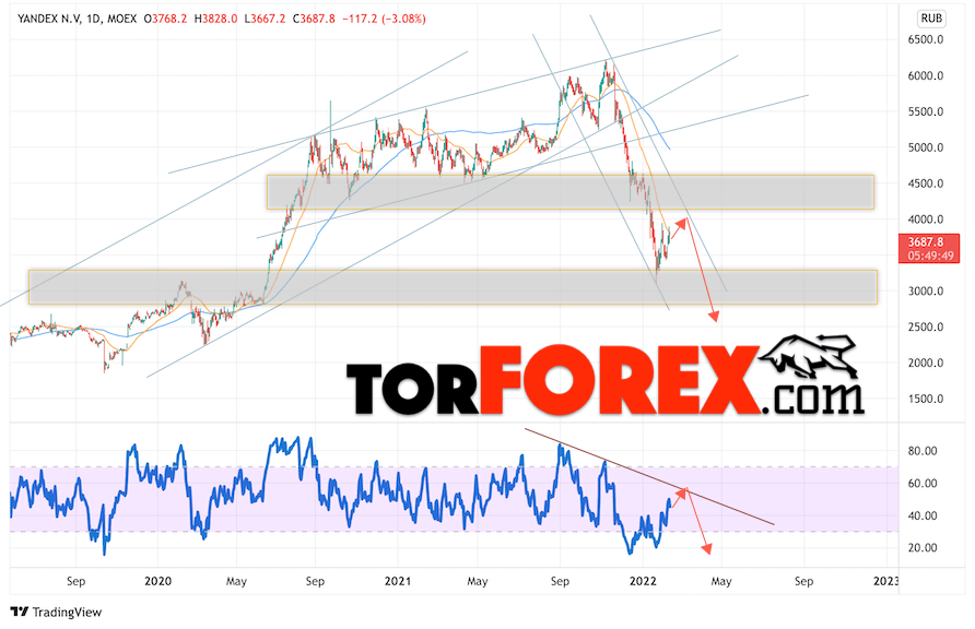 В пользу снижения котировок YANDEX выступит тест нисходящей линии тренда на индикаторе относительной силы. Вторым сигналом выступит отскок от верхней границы нисходящего канала. Отменой варианта падения стоимости акций Яндекс на следующей торговой неделе станет сильный рост и пробой уровня 4505. Это укажет на пробой области сопротивления и продолжение подъёма в область выше уровня 5505. Ожидать подтверждения падения котировок YANDEX стоит с пробоем области поддержки и закрытием ниже уровня 3155, пока эту область на удается пробить медведям.