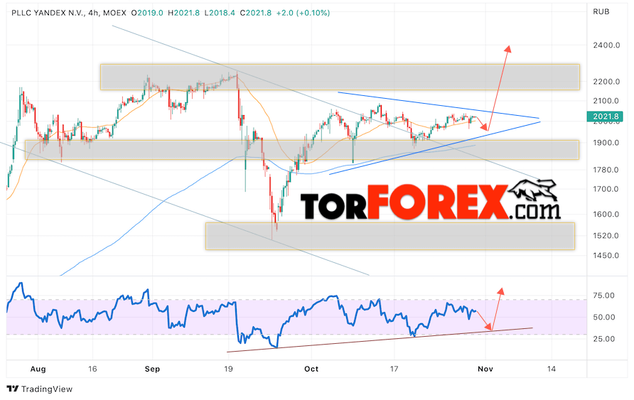 Таким образом, Яндекс прогноз на 31 октября — 4 ноября 2022 предполагает попытку теста области поддержки вблизи уровня 1945. Далее, продолжение роста котировок YANDEX с целью выше уровня 2405. Отменой варианта подъёма цены акций Яндекс выступит падение и пробой уровня 1825. Это укажет на пробой нижней границы модели. В этом случае стоит ожидать продолжения падения с целью ниже уровня 1405.