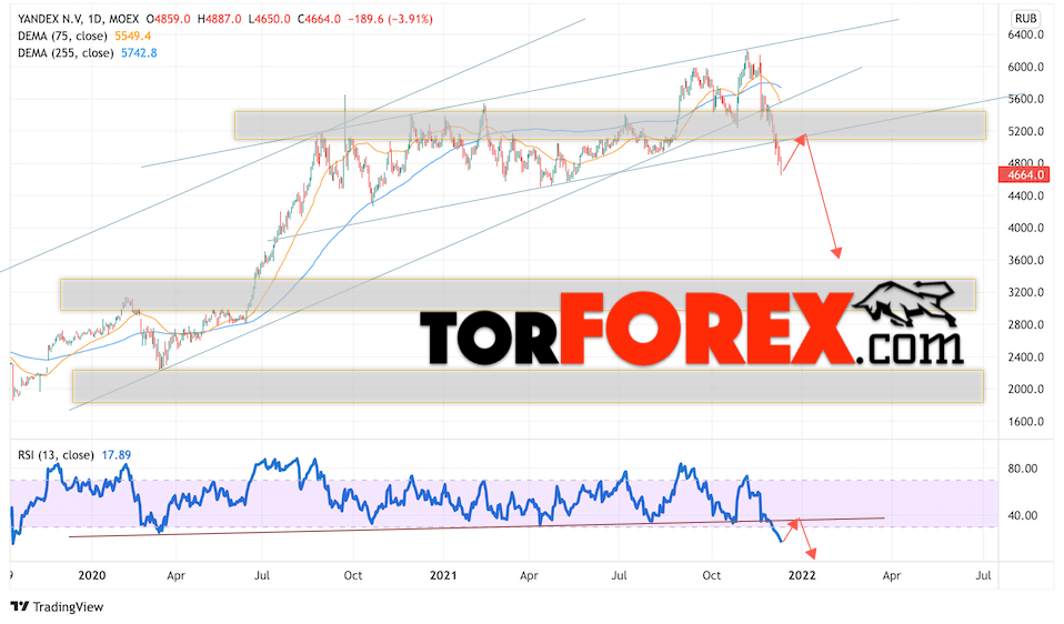 В пользу снижения котировок YANDEX выступит тест пробитой линии тренда на индикаторе относительной силы. Вторым сигналом выступит отскок от нижней границы бычьего канала. Отменой варианта падения стоимости акций Яндекс на следующей торговой неделе станет сильный рост и пробой уровня 5605. Это укажет на пробой области сопротивления и продолжение подъёма в область выше уровня 6075. Ожидать подтверждения падения котировок YANDEX стоит с пробоем области поддержки и закрытием ниже уровня 4405.