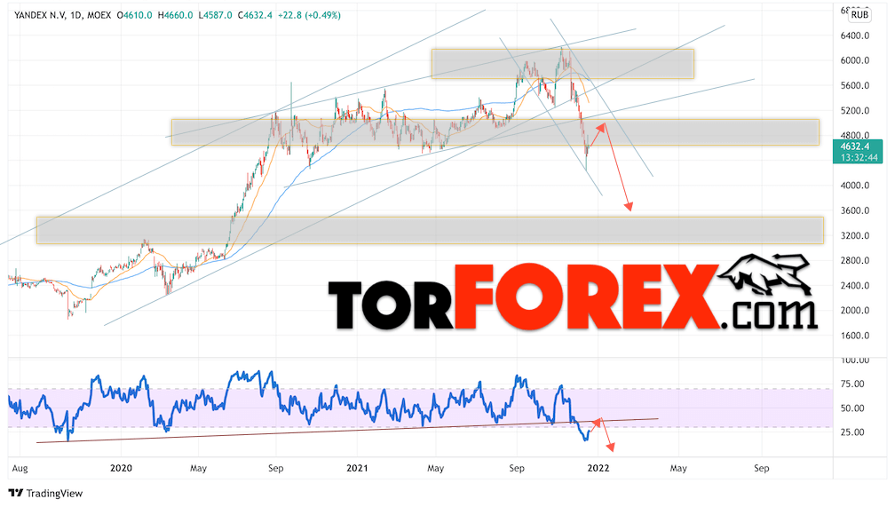 В пользу снижения котировок YANDEX выступит тест пробитой линии тренда на индикаторе относительной силы. Вторым сигналом выступит отскок от нижней границы бычьего канала. Отменой варианта падения стоимости акций Яндекс на следующей торговой неделе станет сильный рост и пробой уровня 5605. Это укажет на пробой области сопротивления и продолжение подъёма в область выше уровня 6095. Ожидать подтверждения падения котировок YANDEX стоит с пробоем области поддержки и закрытием ниже уровня 4255.