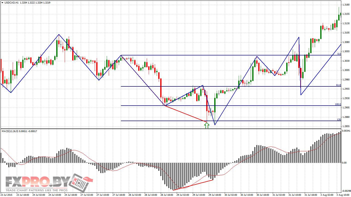 Для того чтобы найти точку входа по этой торговой системе, первое что нам необходимо, это индикатор MACD. Эта торговая система рассчитана на то, чтобы искать точки входа против тренда, либо же предоставляет нам возможность зайти в самом начале нового тренда. Но для того чтобы понять что текущий тренд ослабевает, или заканчивается нам и необходимо использовать индикатор MACD. От этого индикатора нам надо лишь то, что он умеет делать, это показывать дивергенции и конвергенции, это первые признаки того, что текущая тенденция заканчивается. Но проблема в том, что индикатор MACD не показывает точки разворота, он указывает на место, в котором может произойти разворот, но нам ведь надо знать конкретную цену, для того чтобы открыть позицию, а для этого хорошо подходит индикатор Фибоначчи.