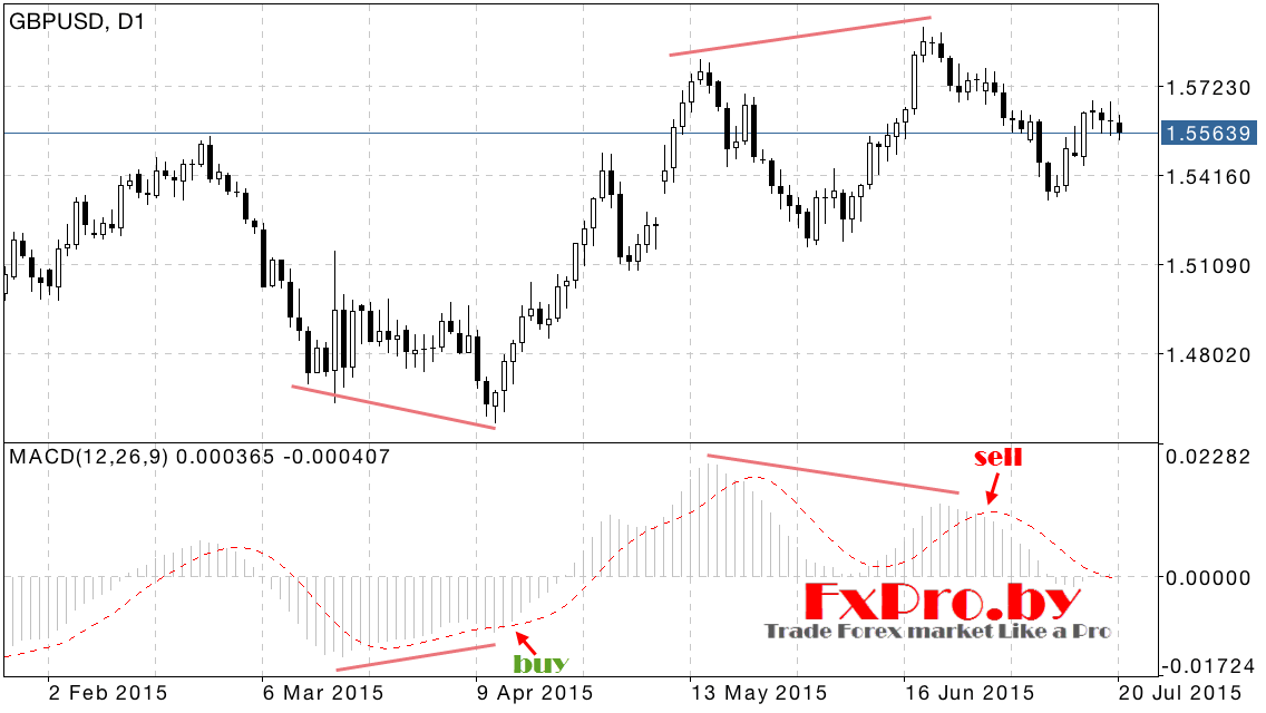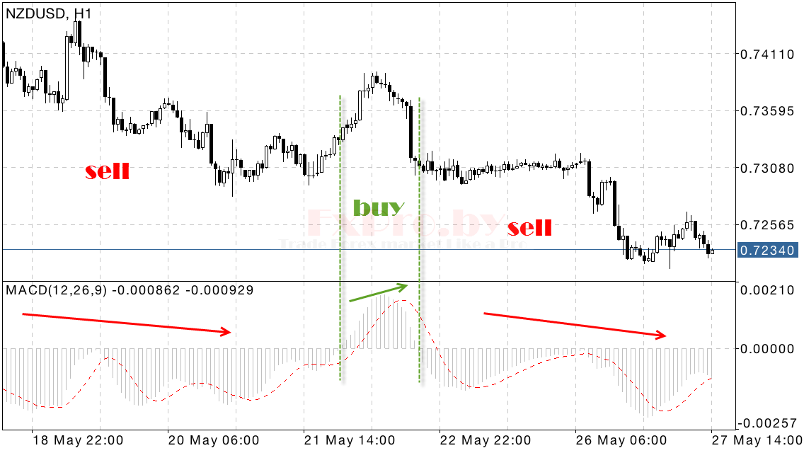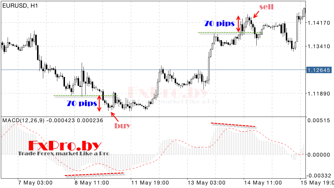 Форекс стратегия дивергенция отлично работает во время бокового тренда, здесь даже можно сразу покупать и продавать на впадинах и на пиках рынка. Как мы отмечали ранее, открывать позиции лучше всего в момент выхода сигнальной линии из области гистограммы MACD, это будет сигналом к завершению текущего движения.
