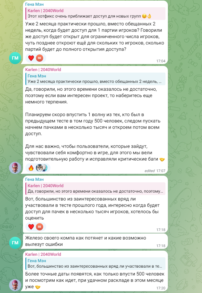 Несмотря на довольно долгую историю игры, отзывов о блокчейн-игре 2040 world очень мало. В основном участники проекта общаются в сообществах проекта — в Телеграмме, под роликами в Ютубе, в Твиттере и т. д. И здесь пользователи часто жалуются на медленную работу разработчиков в плане внедрение нововведений и развитие проекта.