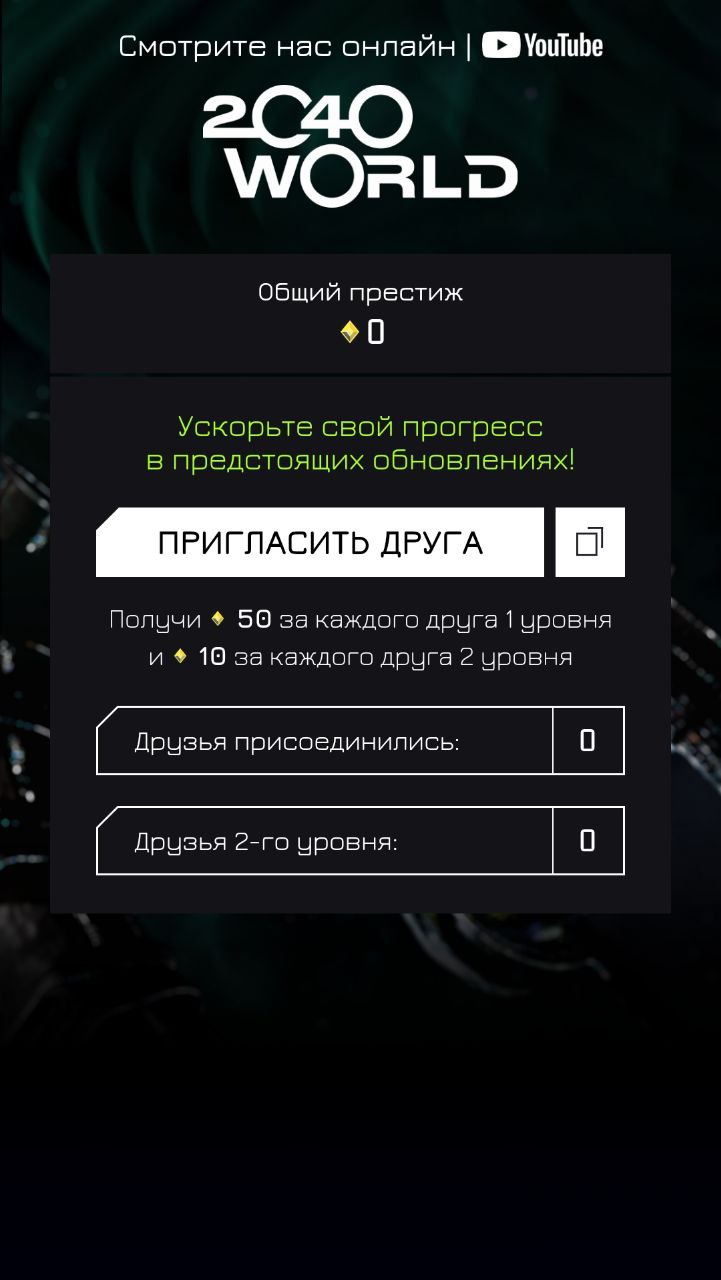 Для проверки своих сил можно запустить бота по ссылке world2040 bot в Телеграмме и лично проверить проект на возможность получения денег. После входа и нажатия на кнопку Начать приложение предлагает пригласить друга и получить 50 монет за реферала 1-го уровня и по 10 токенов за каждого пользователя 2-го уровня.