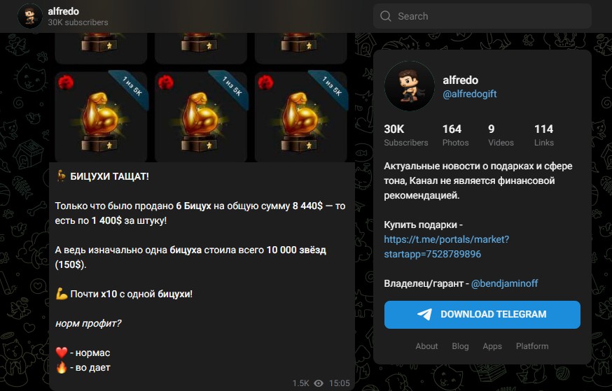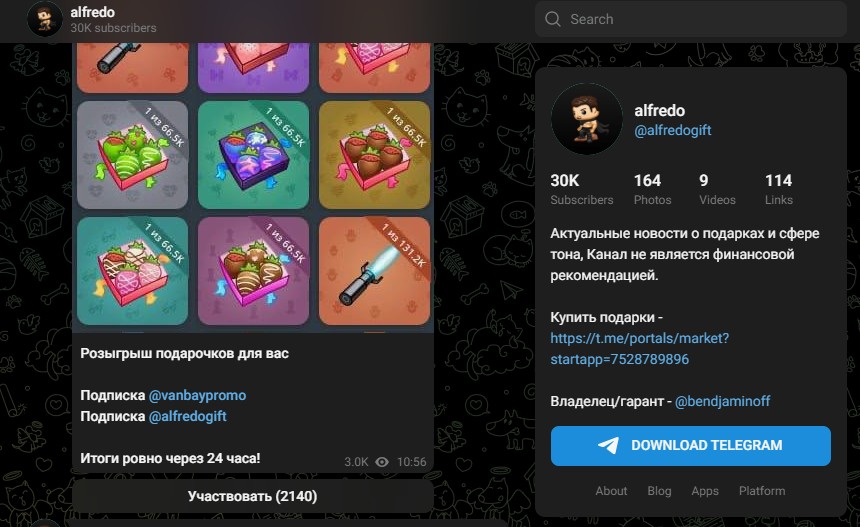Бизнес-модель проекта «Альфредо», судя по всему, многослойная. Первое и самое главное – продажа рекламы. Проводя совместные розыгрыши, автор заставляет участников подписываться на другие каналы и получает оплату от их владельцев. Второй очевидный вариант – партнерские программы. В описании канала стоит прямая ссылка на маркетплейс Portals Market, где можно «купить подарки». Само собой наш Alfredo забирает процент с каждой покупки по его реферальной ссылке.