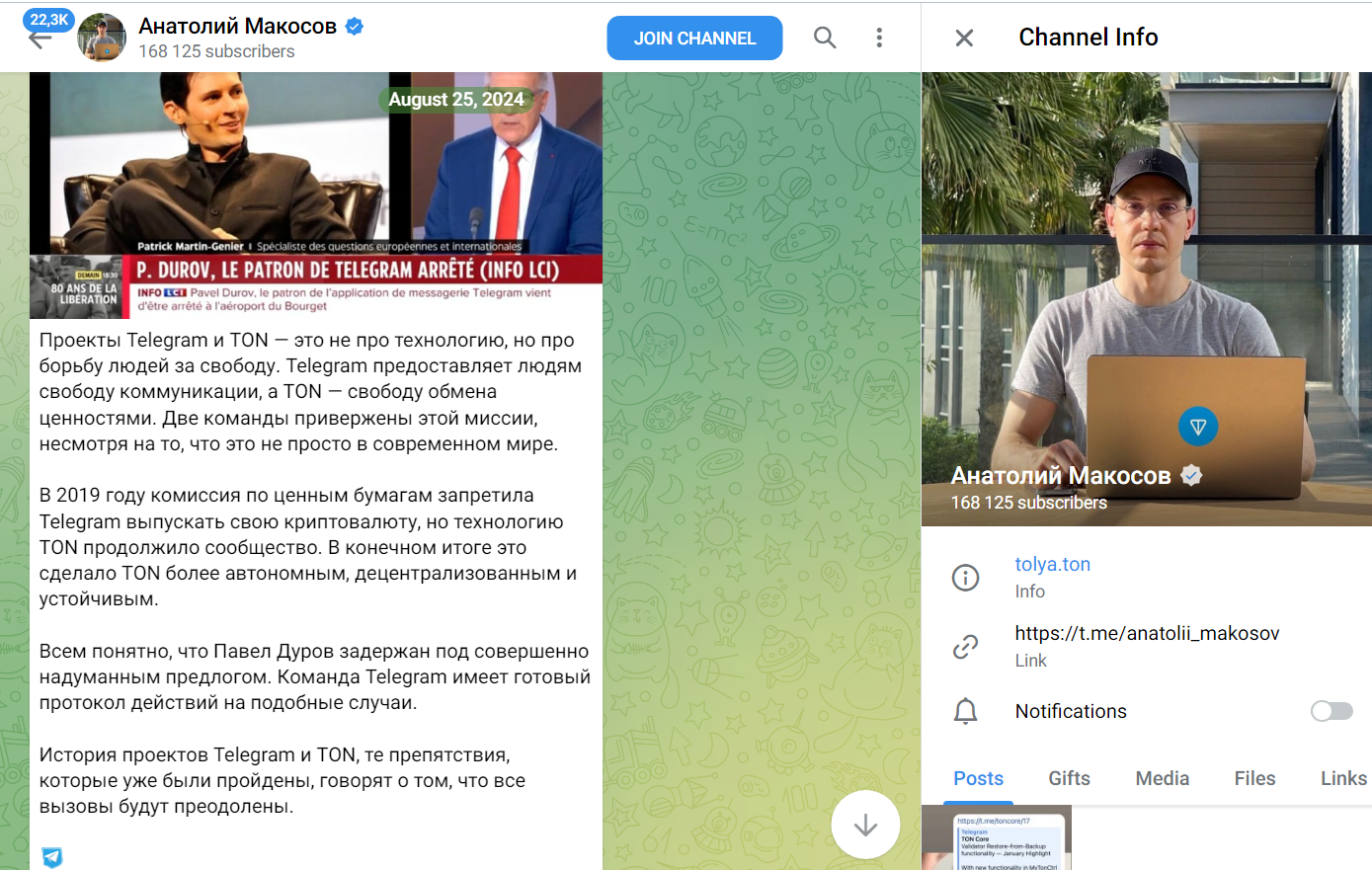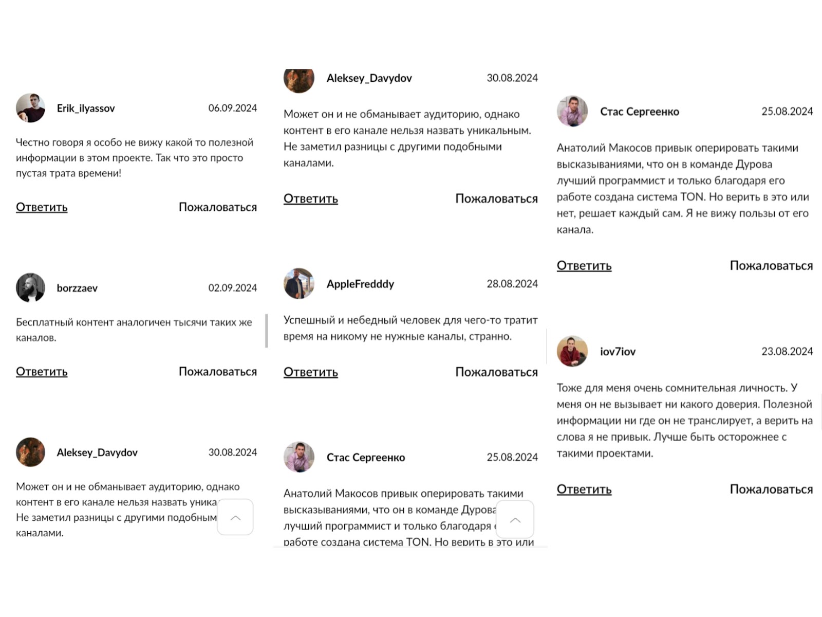 Анатолий ведет бесплатный информационный блог, в котором не было найдено рекламы или признаков скама. Сам Макосов не замечен в крупных скандалах. Что касательно блокчейна ТОН, он является популярным и на 2025 год у него более 100 млн пользователей. Плюсы Телеграмм канала: