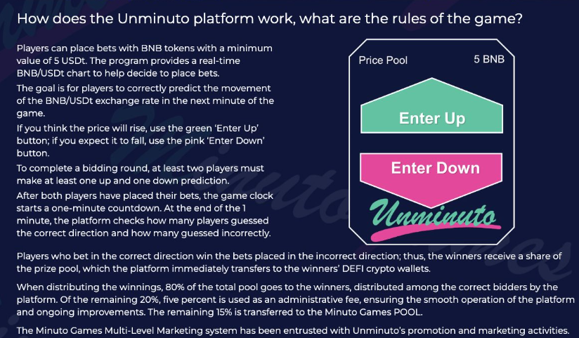 Сайт minuto games com – выполнен крайне непрофессионально. Это просто страница с целой простыней текста. При этом информации о том, что за компания стоит за проектом нет. Правила игры в Minuto Games сводятся к тому, что нужно ставить на повышение или понижение курса BNB/USDT.