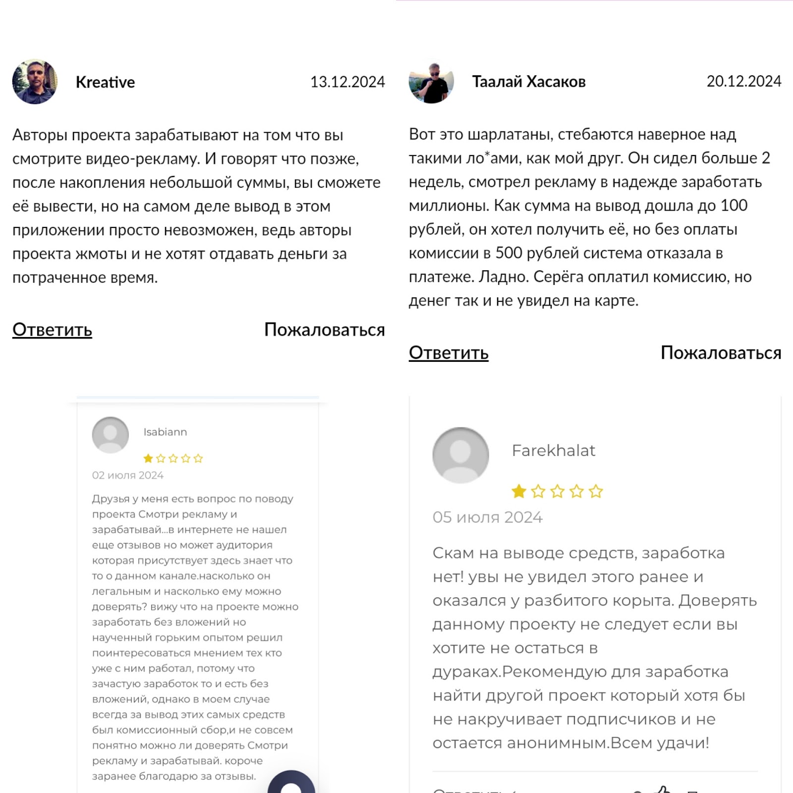 На сайте публикуются позитивные отзывы клиентов про Appmoney App. Такие высказывания могут оказаться поддельными. Во время проверки Appmoney app мы нашли отзывы о том, что создатели игры Аппмоней занимаются обманом, проект это лохотрон, а обещания о заработке с приложением это развод.