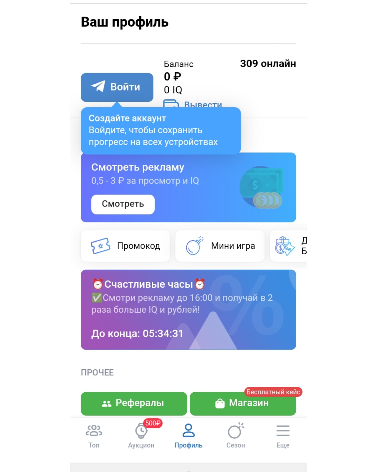 Есть категория “Еще”, где можно следить за историей собственных выводов денег. За 1 видеоролик можно получить от 0.5 до 3 рублей. Также у приложения есть специальные счастливые часы. В этот период можно зарабатывать в 2 раза больше монет. Время обозначено на платформе. Из валют в приложении есть рубли, IQ, а также алмазы. Алмазы можно получать за приведённых пользователей. IQ необходим для улучшения навыков.