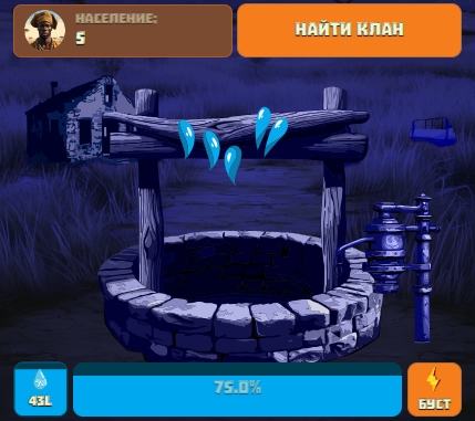 Суть игры – развитие деревни, добыча воды, создание колодцев и стройка насосов разных уровней. Развивая структуру деревни, пользователь сможет увеличить её население.