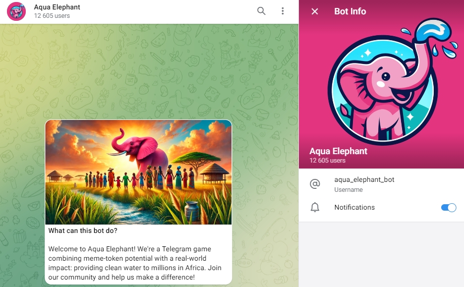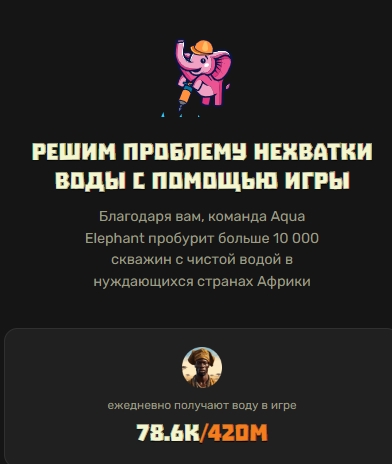 Aqua Elephant презентуется как уникальная тапалка, связанная с благотворительностью. В боте указана миссия проекта – обеспечить чистой водой миллионы жителей Африки. Авторы игры призывают поддержать их цель строить скважины с пресной водой на африканском континенте – внести пожертвование (потратив полученные после airdrop токены на благородные цели) и распространить информацию, привлекая рефералов.