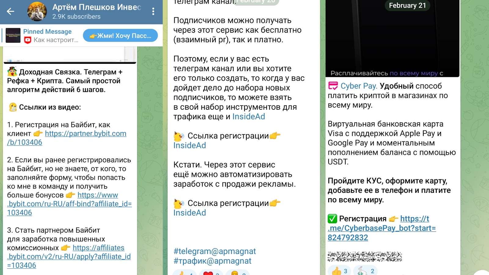 Артем Плешков часто предоставляет советы по выбору проектов для заработка. Он продвигает игры или предоставляет ссылки на сомнительные банковские карты. Помимо этого, оставляет якобы эффективные связки и рекомендует проходить регистрацию на бирже по своему коду.