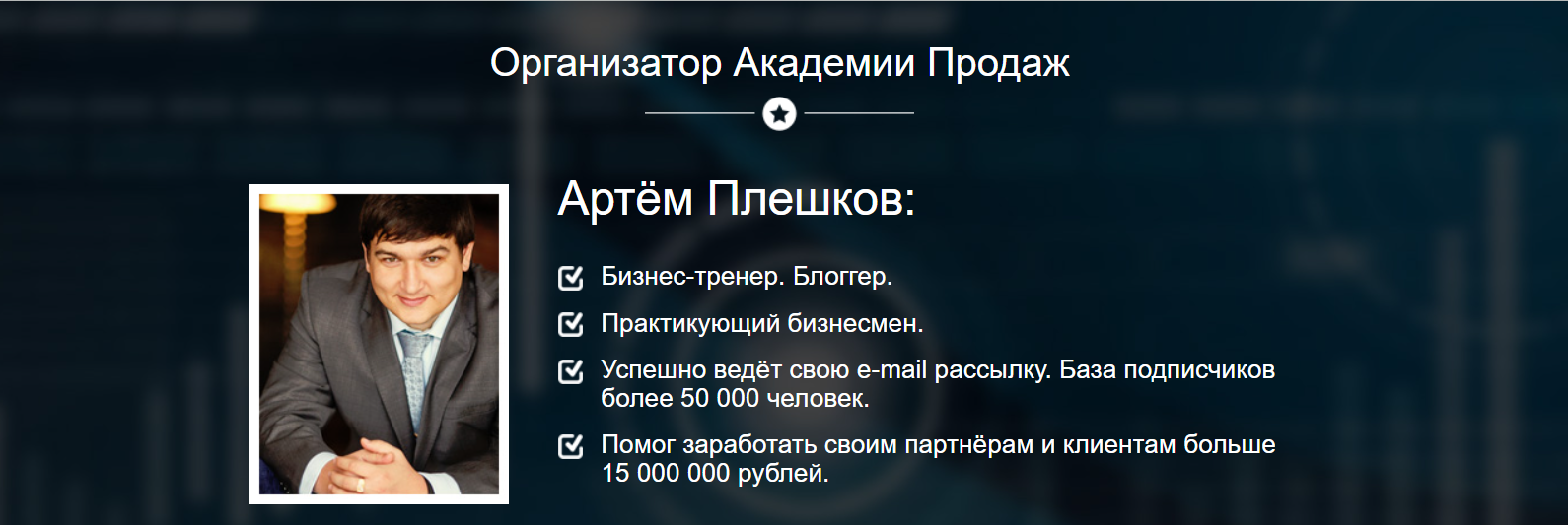 На сайте проекта указано, что Академия Продаж Артема Плешкова является сообществом успешных бизнесменов разных ниш. Комьюнити было создано с целью повысить прибыль всех участников за короткий срок.