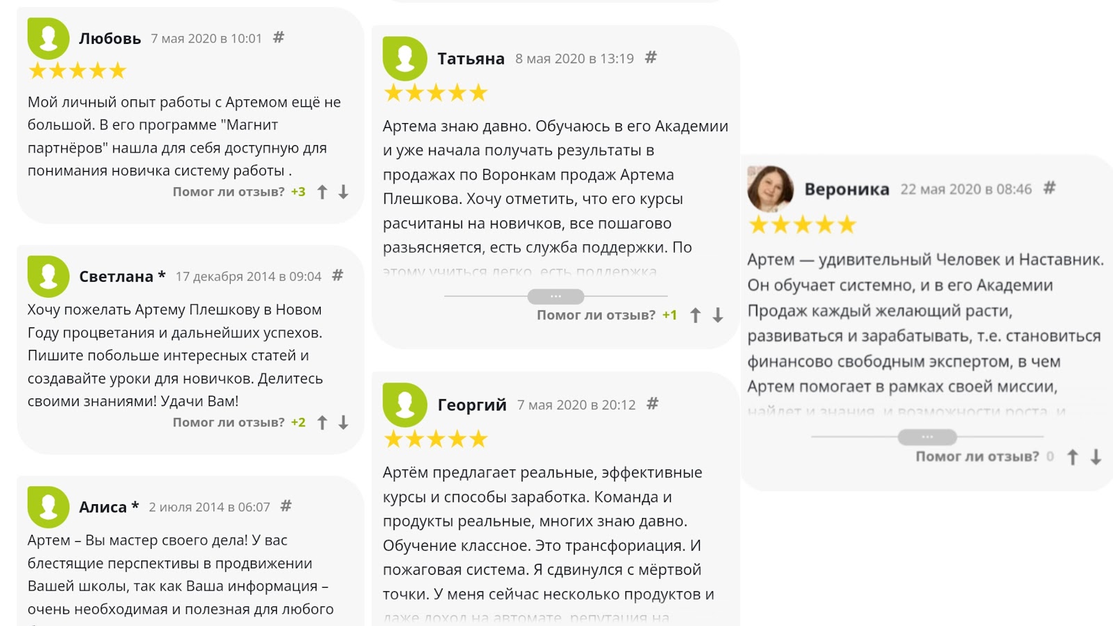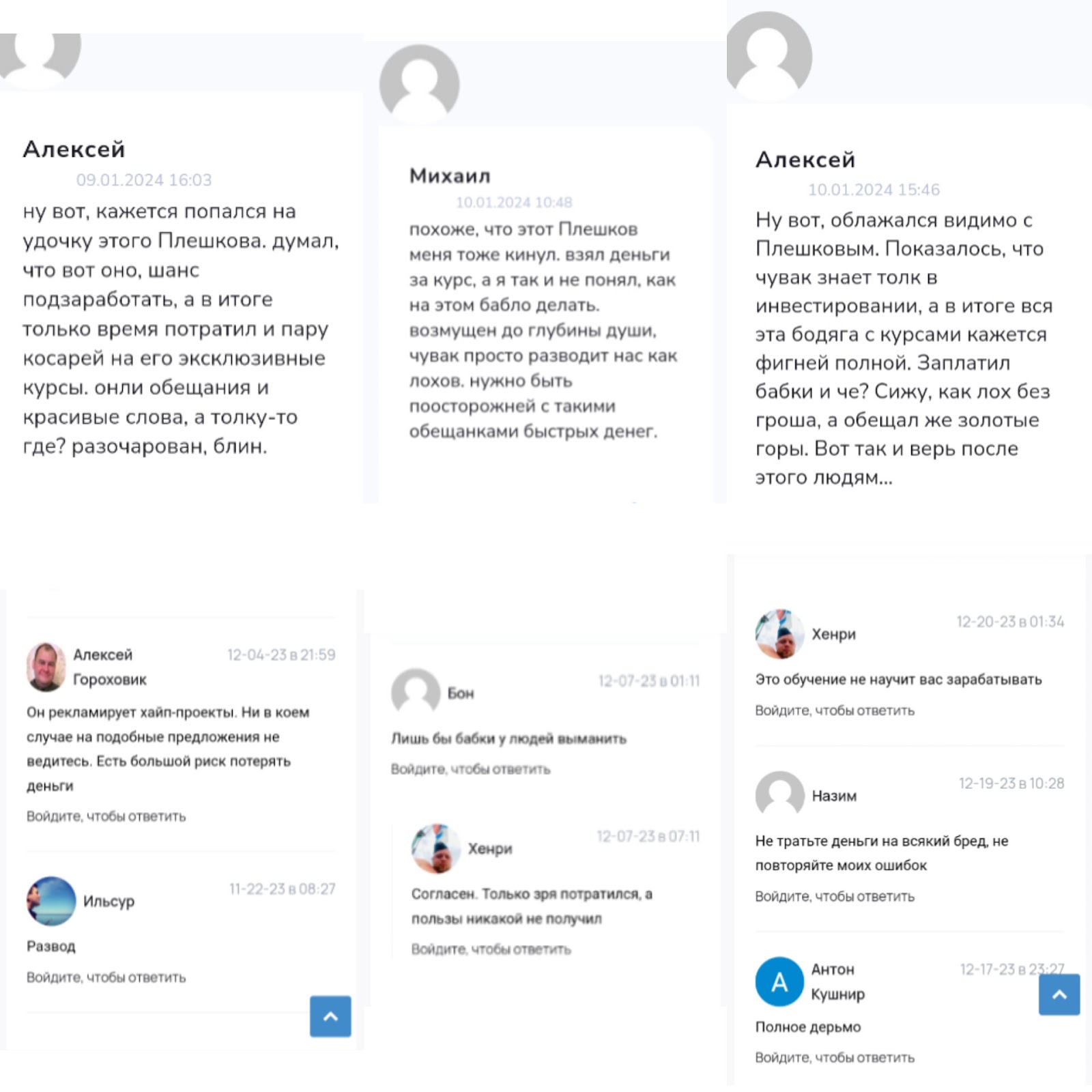 Артем Плешков не доказывает экспертность в бизнесе и инвестировании. Во время обзора мы выяснили, что бизнесмен рекламирует сомнительные проекты и продвигает реферальные ссылки для бирж. В сети у автора неоднозначная репутация, так как многие клиенты остались недовольными приобретенными курсами. Основное о проекте: