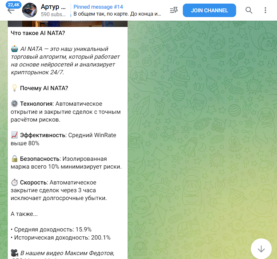 Инвестор предоставляет торгового робота на основе нейросетей AI NATA. Он анализирует крипторынок круглосуточно. В качестве плюсов у программы выделено: