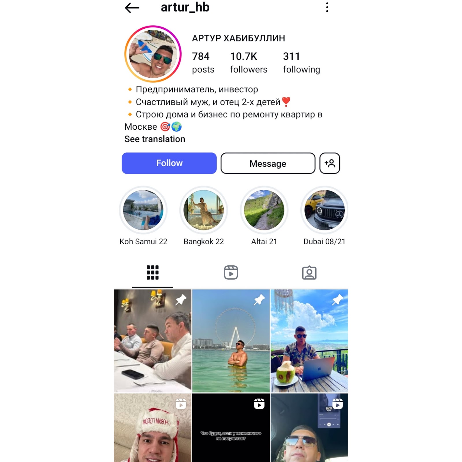 Помимо Телеграмм канала, Артур Хабибуллин оставляет ссылку на страницу в Инстаграме Artur hb. На нее подписано 10.7k пользователей.