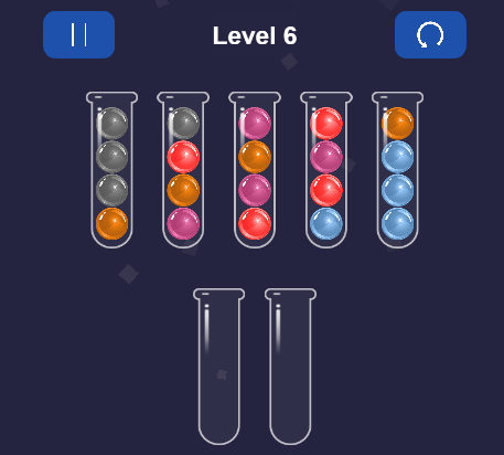 С каждым уровнем сложность повышается – появляется больше колб, самих шариков и цветов. Есть функции отмены хода, перезапуска раунда, активации подсказки и даже добавления новых колб, но всё это влияет на конечный финансовый результат – поэтому пользователи с особым вниманием относятся к разработке стратегии в игре «Сортировка шаров по цвету» в Telegram.