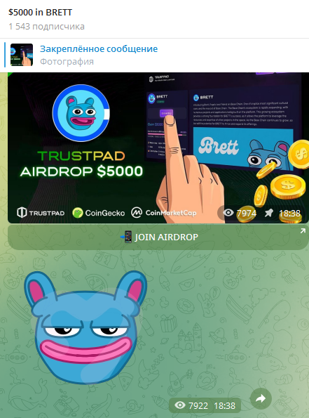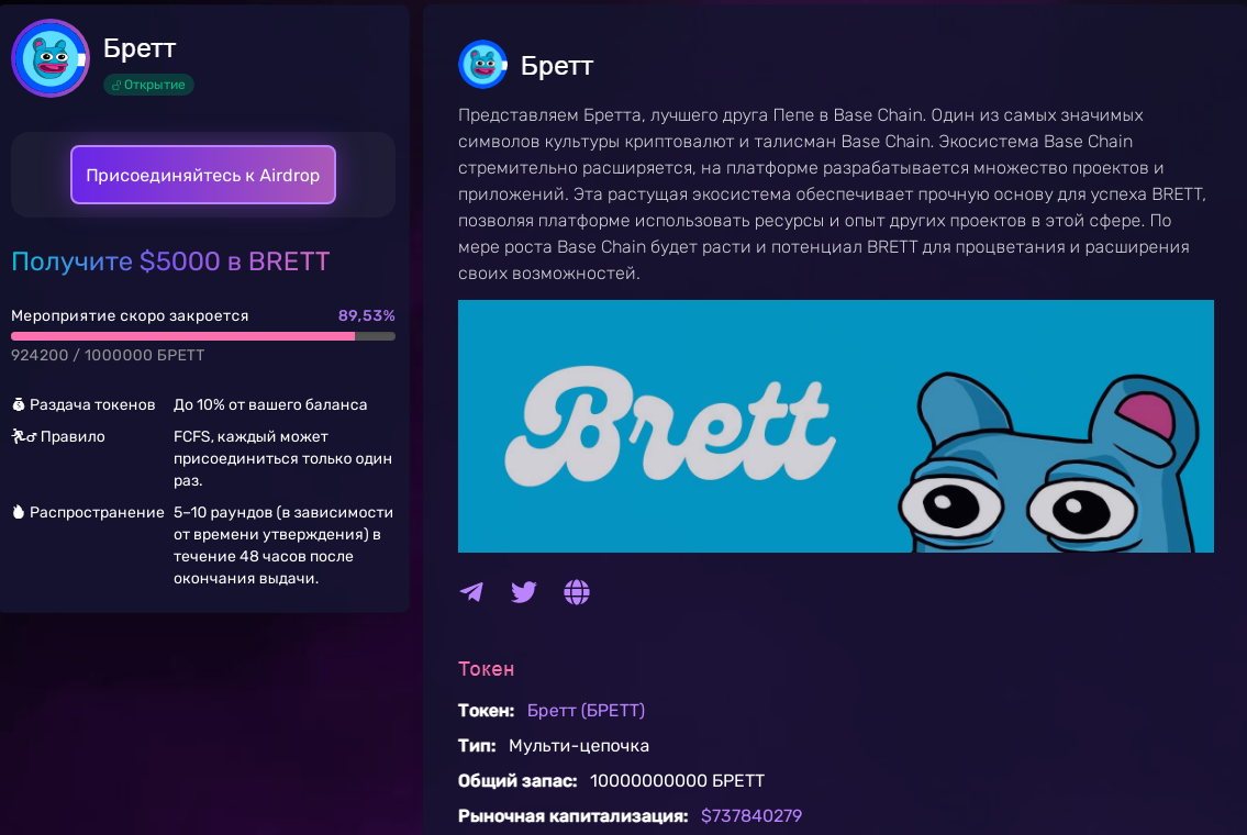 В паблике находится ссылка для перехода на сайт, на котором можно присоединиться к airdrop токена Based Brett.