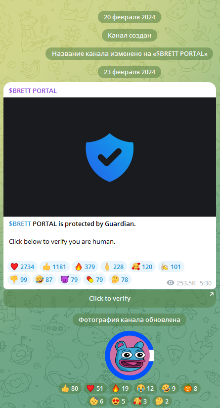 В сообществе BRETT PORTAL закреплена ссылка для верификации аккаунта. Для получения монет разработчики запустили отдельную группу в TG.