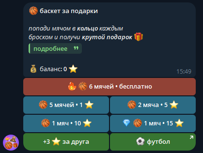 Обзор бота Bas_Gift: отзывы о 🏀 Баскет • Мини-Игра 🎁 и анализ схемы работы p p Баскет Мини Игра — это бот в Telegram, который обещает реальные призы за успешные броски в кольцо. Фактически это казино под видом Mini App. Только вместо фишек и слотов тут мини-игра и Stars.