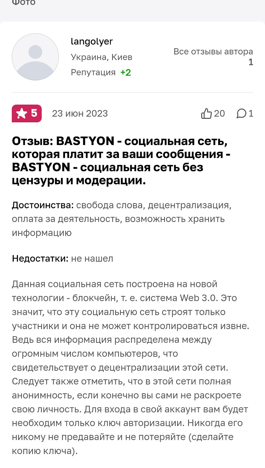 Пользователи, оставляющие положительные комментарии на тематических форумах, хвалят платформу Bastyon com за анонимность, отсутствие жёсткой цензуры и возможность монетизировать контент без банковских ограничений. Авторов привлекает низкий порог входа и то, что деньги поступают напрямую.