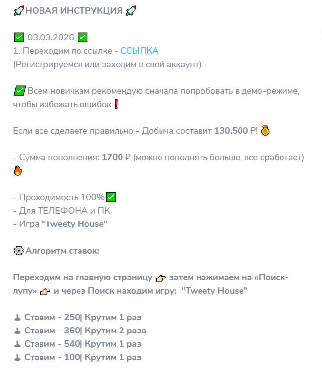 Суть заработка сводится к тому, что пользователю нужно делать ставки в казино, ссылки на которые дает в постах Роман Приват. Он указывает игру и последовательность ставок, которая якобы приведет к гарантированному выигрышу.