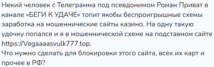 Роман Приват запускает собственные поддельные казино, например, с канала Беги к Удаче пользователей отправляли на сайт Vegaaaasvulk777 top. На нем требовалось пополнить счет и сделать ставки в последовательности, указанной Романом.