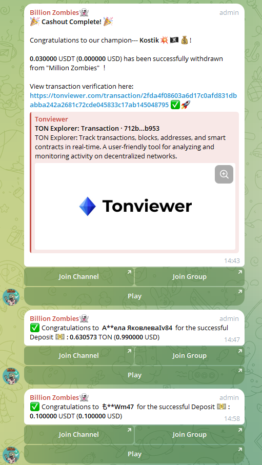 В чате 18 тысяч подписчиков. Они не особо что-то пишут. В основном сообщения приходят от бота игры. В них рассказывают о депозитах и выводах пользователей. Хотя сообщений про выводы достаточно много, можно проверить транзакции, но их суммы – крайне малы. Обычно пользователи выводят по паре центов.